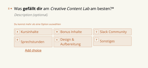 Bevor ich dir erkläre, wie du so eine Verzweigungslogik erstellst, lass mich kurz beschreiben, wann du diese einsetzen kannst. In meinem Feedback-Fragebogen habe ich abgefragt, was den Teilnehmenden an meinem Onlinekurs am besten gefällt. Um die Antworten besser auszuwerten, habe ich dafür eine Multiple-Choice-Frage mit 6 Antwortmöglichkeiten erstellt.